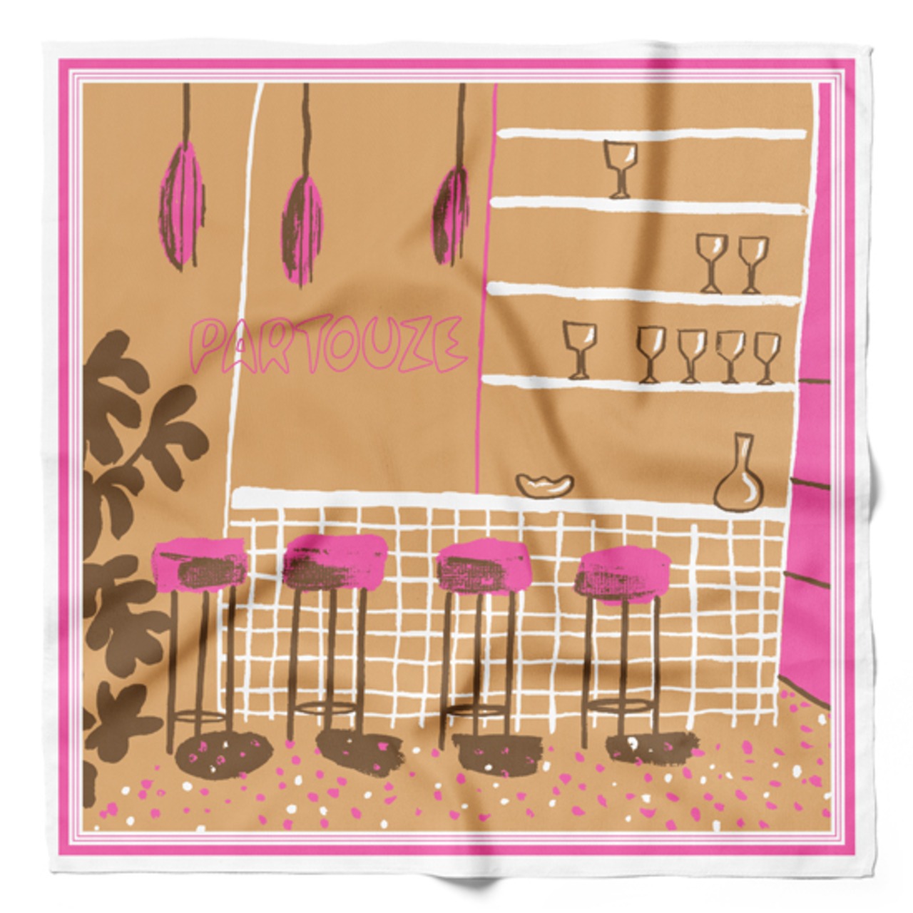 洗練された空間を、アーティスティックに描いたインテリアシリーズ。大人の雰囲気漂うバーカウンターのイラストが、ハンカチ全体にプリントされています。落ち着いたベージュを基調に、発色の良い鮮やかなピンクがデザインのアクセントに。年齢層も幅広く、男女問わずご使用頂けるデザインで、服装を選ばずデイリーユースにお使いいただけます。ご自身用はもちろん、インテリアやBARに興味がある方への贈り物にもおすすめの一枚です。