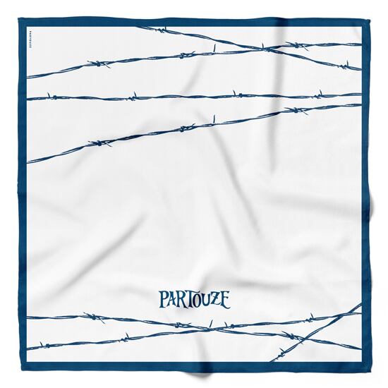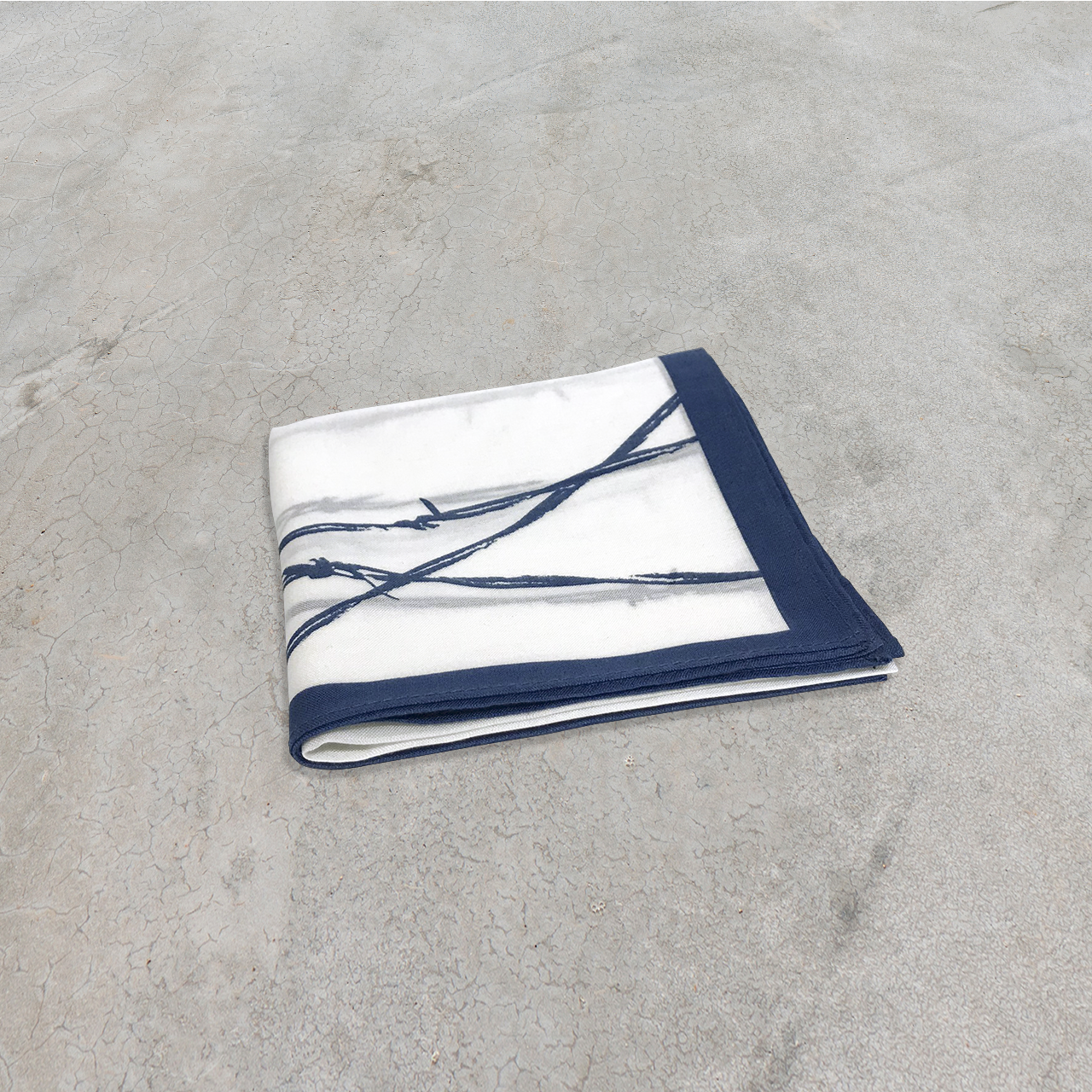 有刺鉄線を這わせたような大胆なデザインが印象的な、エッジの効いたクールなハンカチ。飽きの来ない洗練されたシンプルなデザインなので、ユニセックスに長くご愛用いただけます。どんなコーディネートにも自然と馴染むので、いろんなスタイルに合わせてデイリーユースに使えそう!1枚あれば重宝すること間違い無しのアイテムです。ご自身用からギフトにまで幅広くお使いいただけます。