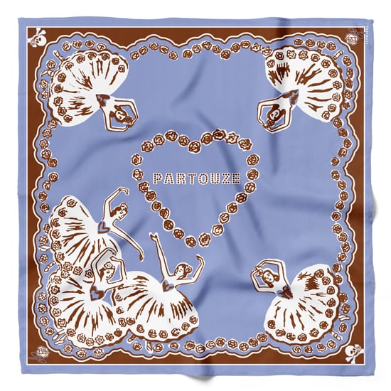 PARTOUZEで人気のバレリーナシリーズのハンカチから、かわいいだけじゃなくちょっぴりスパイシーな大人っぽさが漂う『トーシューズ』のハンカチ。プリマ・バレリーナが軽やかに踊っているシーンをデザインし、端にはワンポイントでドクロとバラの花をあしらいました。バレリーナとドクロの甘辛な組み合わせが特徴的です。ブルー×ブラウンの配色で、可愛くなりすぎず引き締まった印象に。ご自身用はもちろん、ギフトアイテムとしてもおすすめの1枚です。