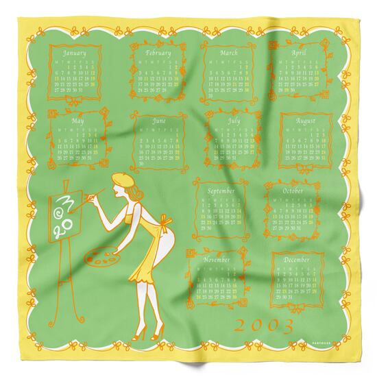 見て楽しい、広げて楽しい、持って楽しいカレンダーシリーズのハンカチ。こちらは2003年のカレンダーハンカチです。キャンバスに“2003”とドローングしているセクシーな女性のイラストが魅力的。過去のカレンダーですが、とても可愛いデザインなので時期が過ぎていても気にせずにお使いいただけます。お洒落のアクセントとして、バッグに忍ばせてみてはいかがでしょうか。2003年生まれの方への贈り物としてもおすすめのアイテムです。