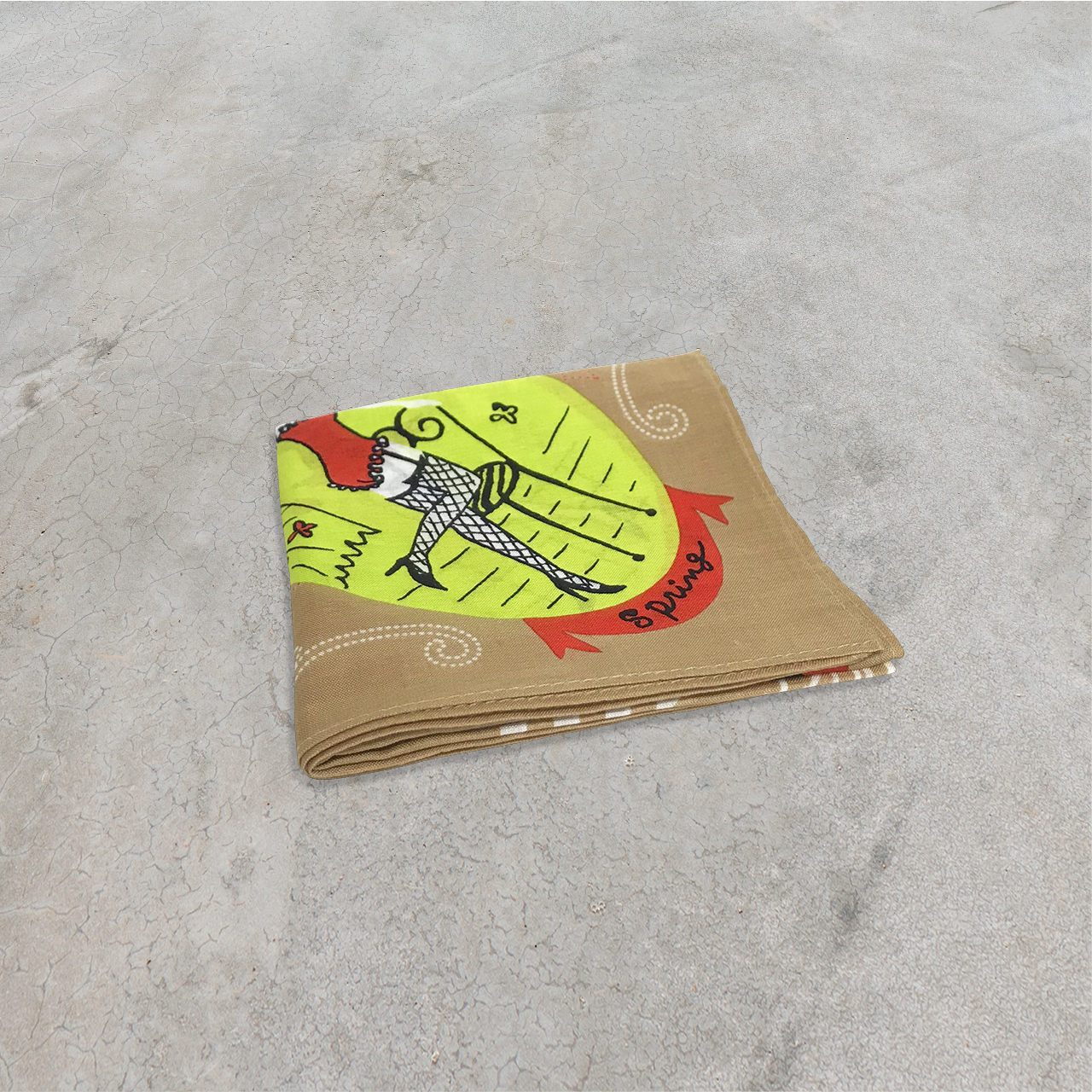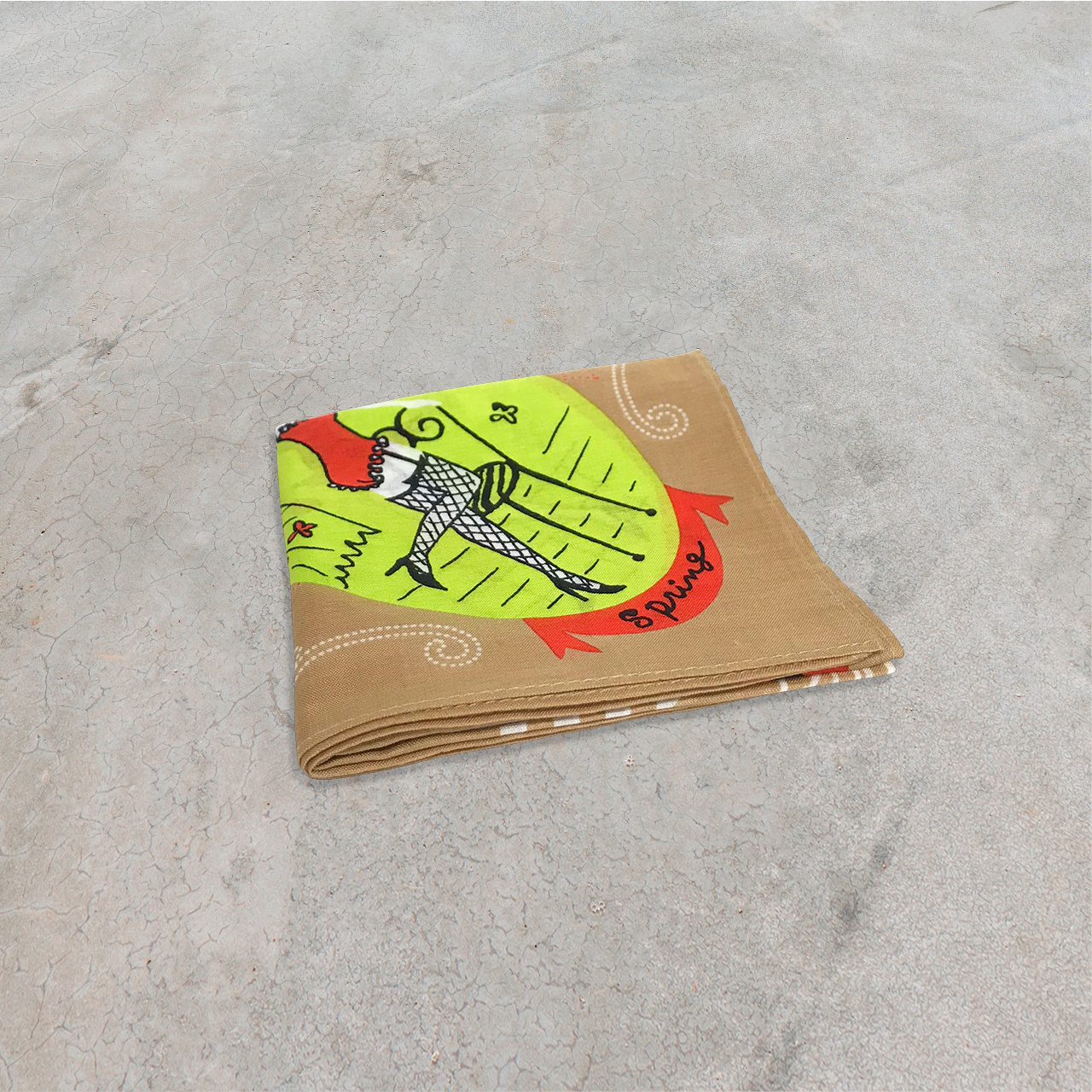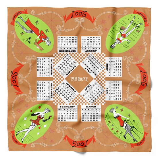 見て楽しい、広げて楽しい、持って楽しいカレンダーシリーズのハンカチ。こちらは2001年のカレンダーハンカチです。春夏秋冬それぞれのシーンをイメージして描いた女の子のイラストがとってもキュート!細部までデザインにこだわって描かれたセクシーなコスチュームも魅力的です。ベースカラーのベージュに、ライムグリーンとオレンジのカラフルな色彩がよく映えます。デイリーユースや、ちょっとしたギフトなど幅広く活躍する1枚です。